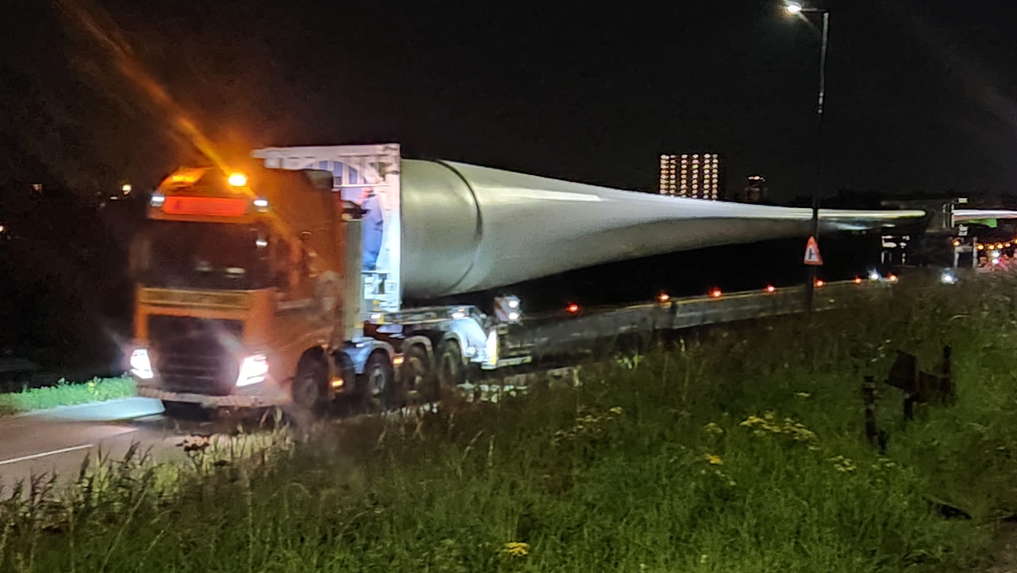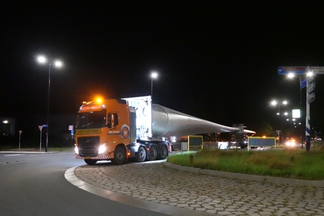 In de late uurtjes van 22 en 24 augustus zijn de rotorbladen van de twee windturbines naar de bouwplaats in het Oeverbos getransporteerd. De bladen zijn van de Rotterdamse haven via Utrecht naar Vlaardingen gebracht. Niet de kortste route, maar dat had alles te maken met de lengte van het bladen, 57m en deze kunnen niet door een tunnel vervoerd worden. Om een dergelijk transport te realiseren zijn veel mensen in de weer. Voor de begeleiding van het transport, de afzetting en te zorgen dat het vooral veilig gebeurd. Een extra complicatie was dat er gewerkt wordt aan het kruispunt bij de afslag van de A20 ter hoogte van de afslag Vlaardingen West. Het was bijzonder indrukwekkend om 3 vrachtwagens van elk 65 achter elkaar de afrit af te zien komen en dan vervolgens uiterst voorzichtig onder het viaduct door te zien gaan. Waarna vervolgens bleek dat er nog een boom in de weg stond en een reclame zuil. Al met al is alles netjes afgeleverd en kijken we uit naar het volgende transport t.w. de onderdelen van de torens. Met de huidige planning worden deze verwacht in week 35 en dan kan het in elkaar zetten van de turbines uitgevoerd gaan worden. Vanaf het fietspad langs het water kunt u de activiteiten volgen.