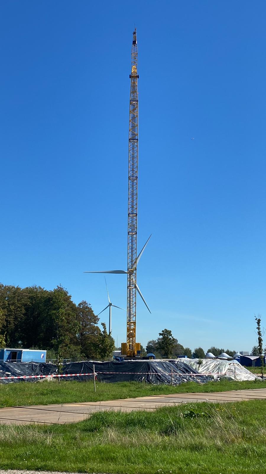 Nog maar een paar weken geleden zagen we hoe de wieken en de onderdelen van de mast met uiterste voorzichtigheid via de Marathonweg naar de bouwplaats werden gereden. Het weer heeft fantastisch meegewerkt want als het maar een beetje waait dan kan zo’n windmolen niet opgebouwd worden. Maar afgelopen week was het bijna windstil. De mast wordt in 3 stukken van elk zo’n 50 ton in elkaar gezet. Dan gaat de gondel er bovenop en worden de onderdelen door een luik in het dak naar binnen getakeld. De gondel staat op 80 meter hoogte; voor deze klus wordt dan ook een kraan gebruikt van maar liefst 100 meter. Vervolgens worden een voor een de wieken aan de rotor vastgemaakt.