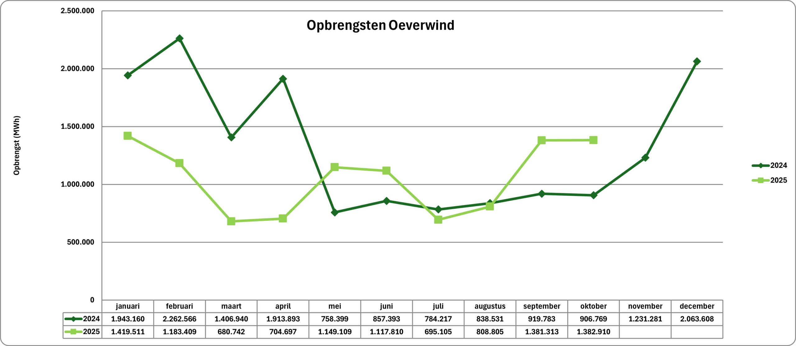 Hoeveel stroom wekken de twee windmolens van Oeverwind op? Op deze pagina die we maandelijks bijwerken, houden we je op de hoogte van de prestaties van windturbines (WT01 en WT02). De cijfers zijn afkomstig van energieparter Groendus en onze windmolenaars.