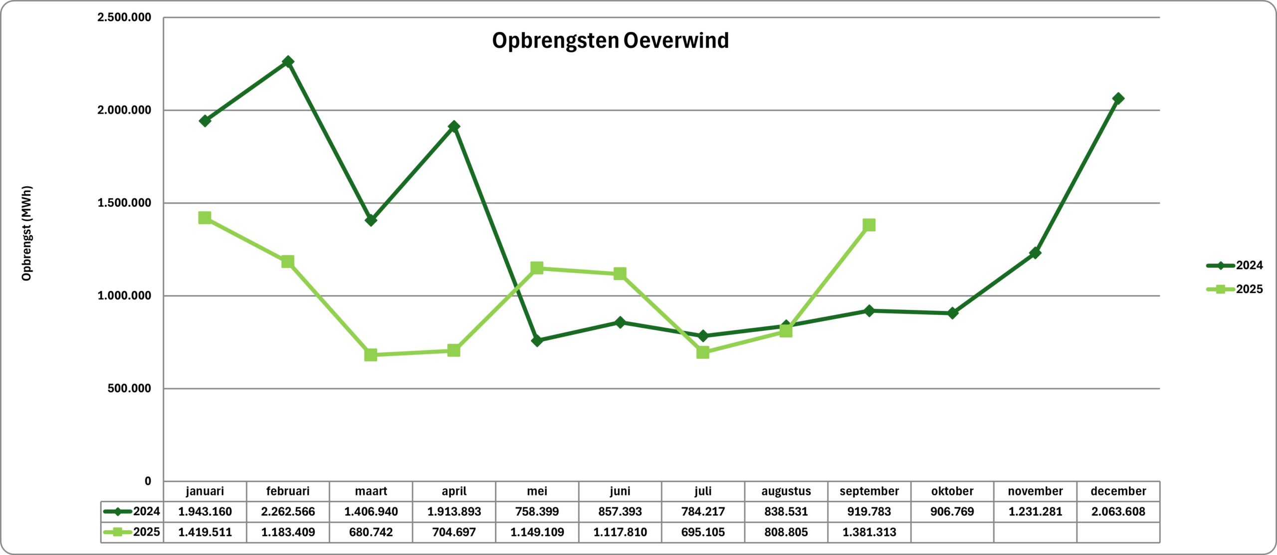 Hoeveel stroom wekken de twee windmolens van Oeverwind op? Op deze pagina die we maandelijks bijwerken, houden we je op de hoogte van de prestaties van windturbines (WT01 en WT02). De cijfers zijn afkomstig van energieparter Groendus en onze windmolenaars.